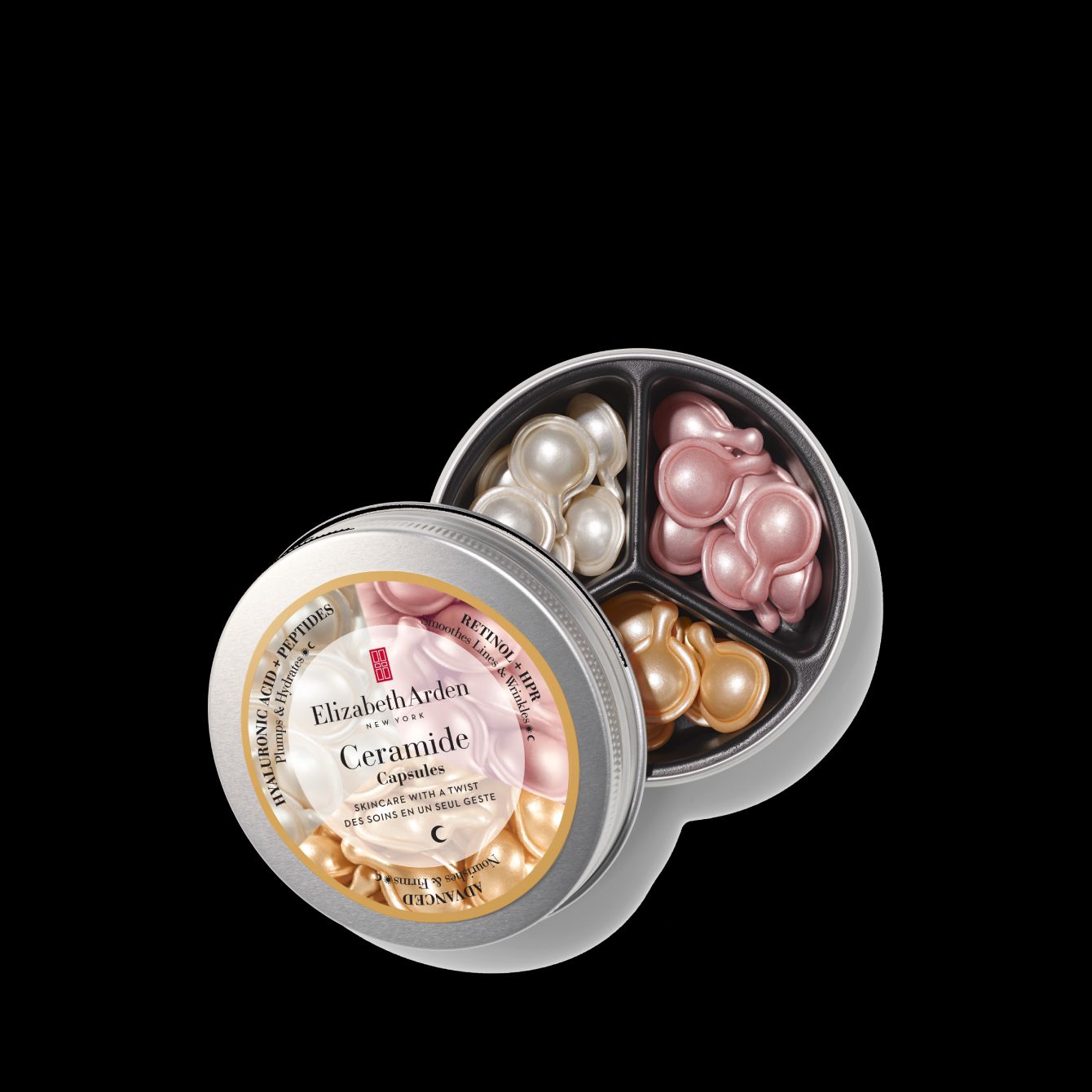 Trio of targeted single-dose capsule serums, perfect for travel. This spill-proof tin contains Retinol+HPR, Hyaluronic Acid + Peptides and Ceramide serums to smooth and refine, plump and hydrate the skin, and nourish and firm.