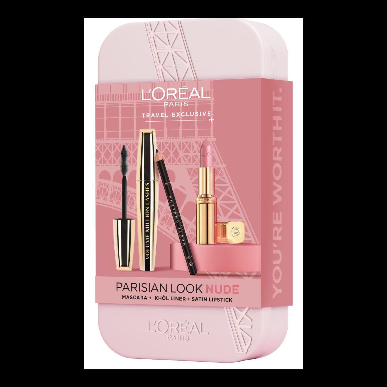 Get the sophisticated Parisian nude look from L'Oréal Paris. This Makeup Set includes the Volume Million Lashes mascara, Haute Couleur Crayon Khôl Eyeliner Noir Silk and Color Riche Satin Lipstick Nude 235.